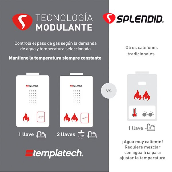La tecnología termostática modulante Templatech permite reducir el consumo de gas y tener agua caliente siempre a temperatura constante. Gracias a su sistema electrónico de control, basta con seleccionar la temperatura en el display digital, el calefont regula el paso de gas por los quemadores y mantiene constante el nivel de calor.