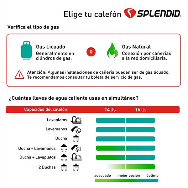 Entregará agua caliente a duchas, lavamanos o lavaplatos en tu hogar sin necesidad de fósforos ni chisperos. Múltiples sistemas de seguridad. Todos los calefones Splendid cuentan sistemas de seguridad que garantizan el correcto funcionamiento de nuestros equipos y el bienestar tu familia.