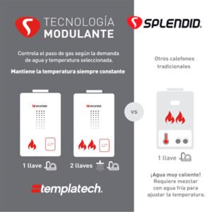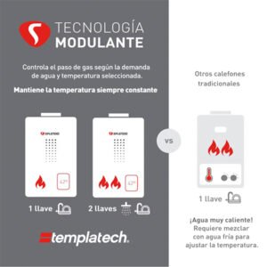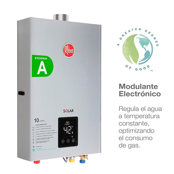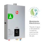Calefont digital Rheem de tiro forzado con tecnología modulante que regula la temperatura del agua y ahorra en el consumo de gas en casa. La tecnología modulante de Rheem permite reducir el consumo de gas y tener agua caliente siempre a temperatura constante.